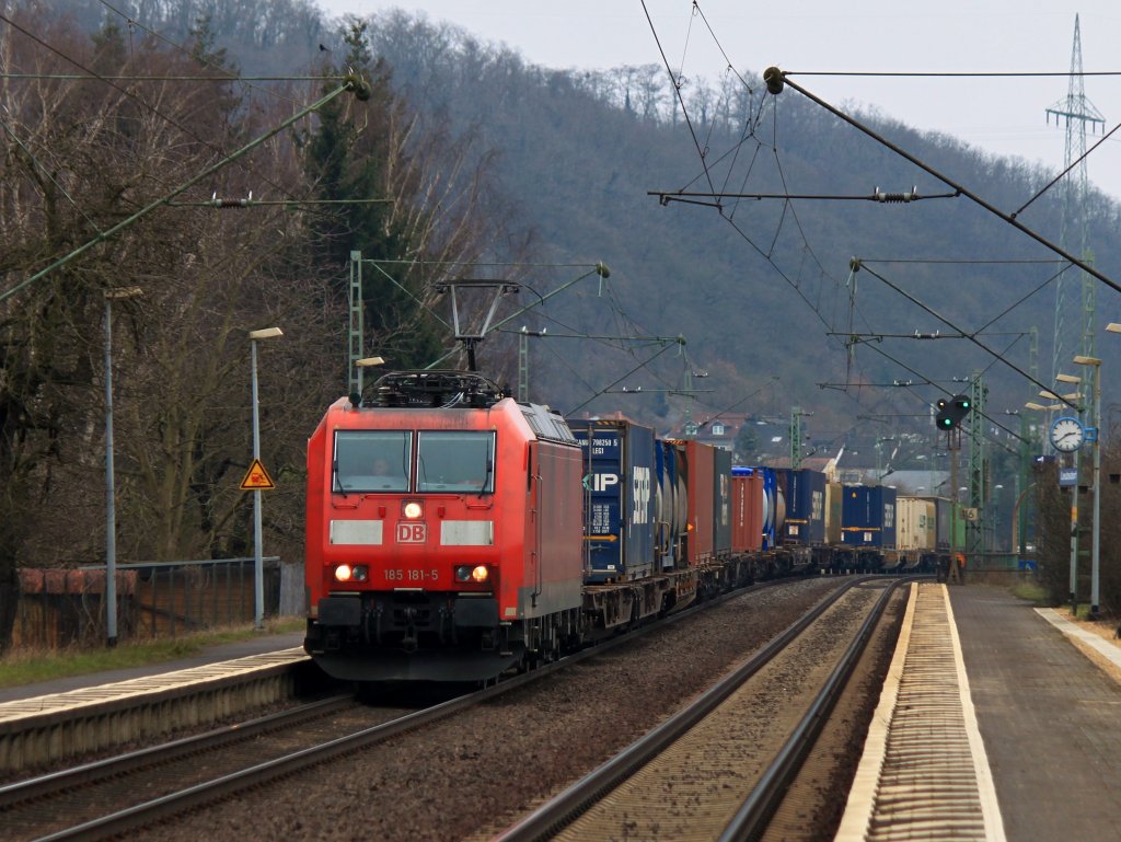 185 181-5 mit einem Containerzug am 03.04.2013 von Süden kommend auf der rechten Rheinstrecke in Leubsdorf.