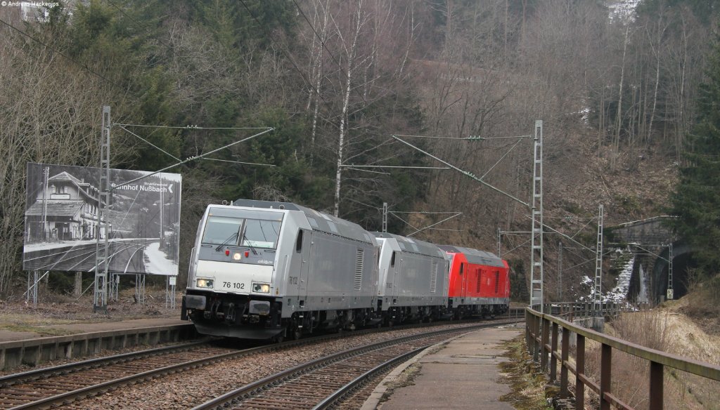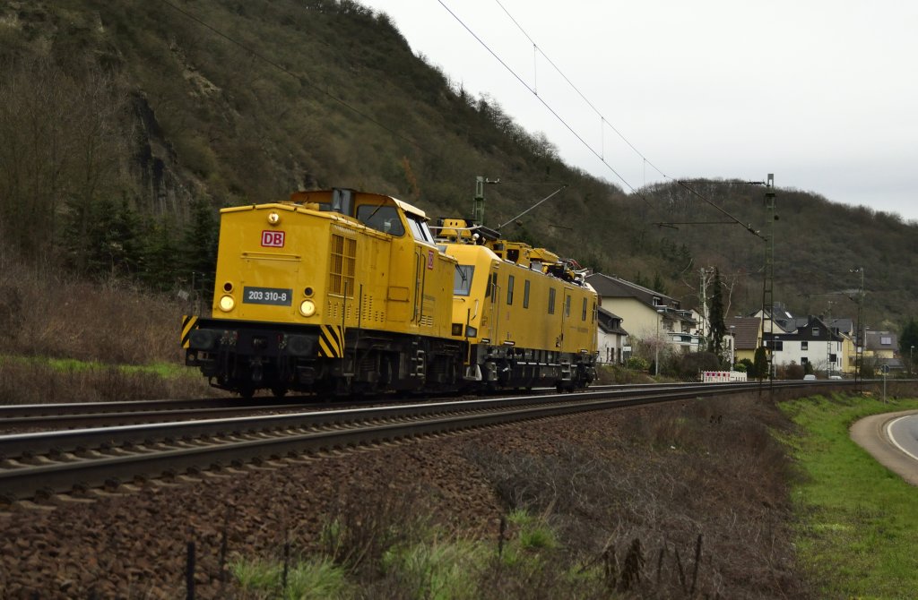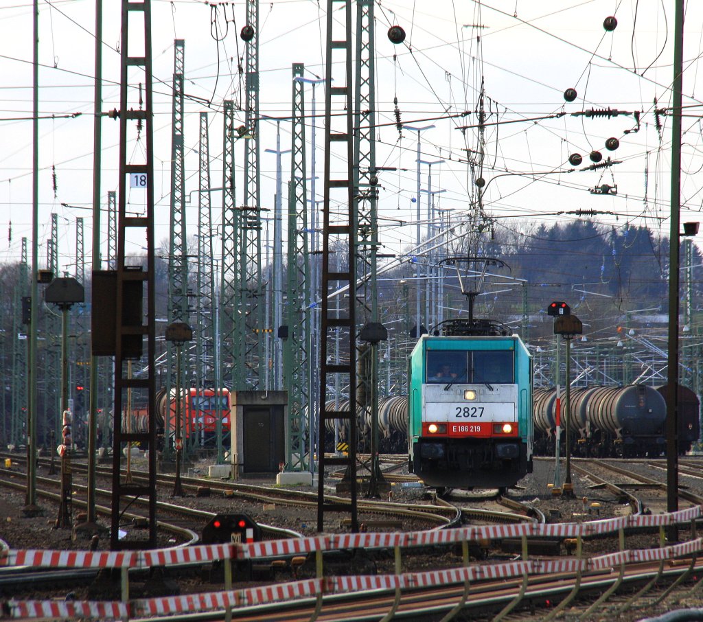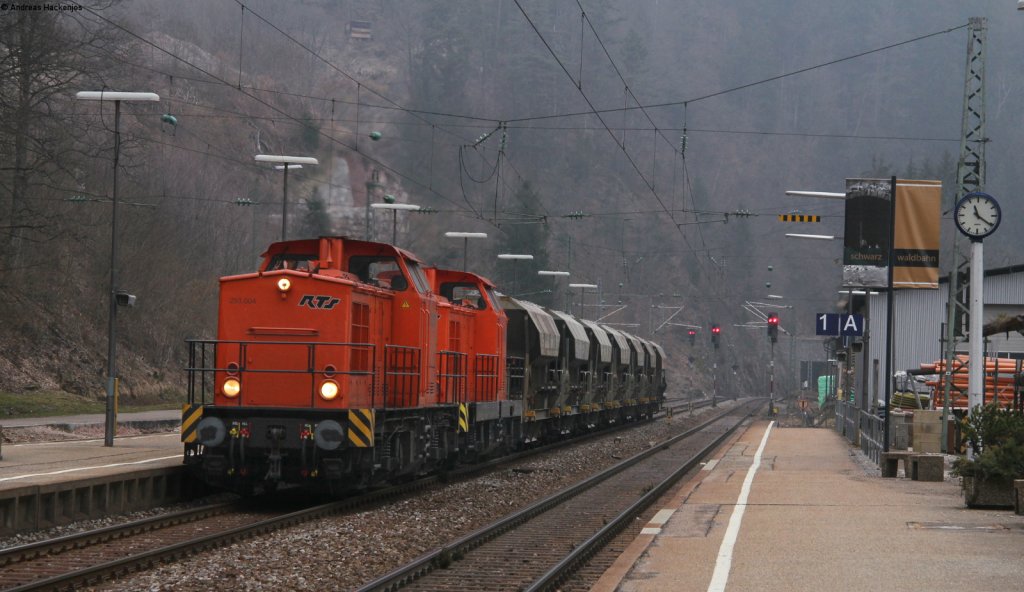 Locon 219 (203 559-0) verläßt am 11.01.2013 mit einem mit Abraum beladenen Niederbordwagenzug die Baustelle in Aachen West nach Stolberg. Rechts im Bild steht 2016.907 von RTS, die am 27.03.2013 in Obereggendorf (Niederösterreich) auf einen Messzug aufgefahren ist.