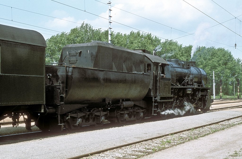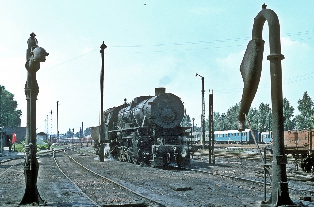 141 209-7 hält mit einem Nahverkehrszug im Bahnhof Stuttgart-Bad Cannstadt (Mai 1978)