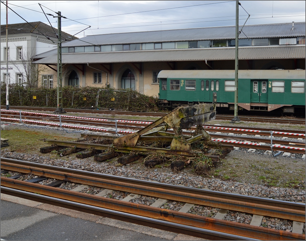 Als hätte man ihn gerade aus dem See gezogem. Der zugewachsene Prellbock des Stumpengleises am Konzil macht auch in hohem Alter eine gute Figur. Auf dem Präsentierteller fast am Bahnsteig. Konstanz, April 2013.