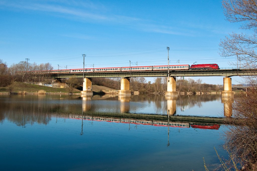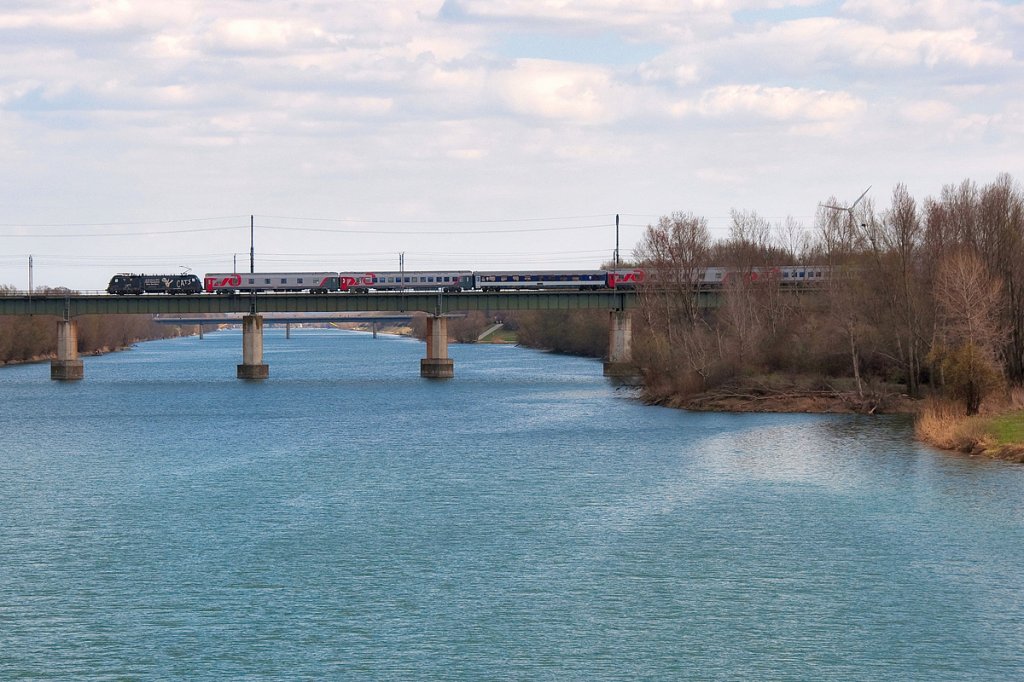 Eurocity 278 überquert die neue Donau in Wien. Die Aufnahme ernstand am 14.04.2013, als es noch fast windstill war.