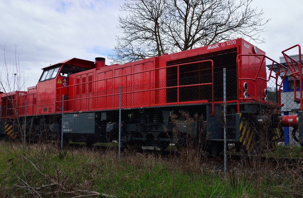 Auf dem Ausziehgleis der Lokomotivenfabrik Gmeinder in Mosbach steht diese ehemalige CFL MAK 1206/alias 9282 000 1504-0 L- und wartet auf eine Aufarbeitung in der Lokmanufaktur Badens. 13.4.2013