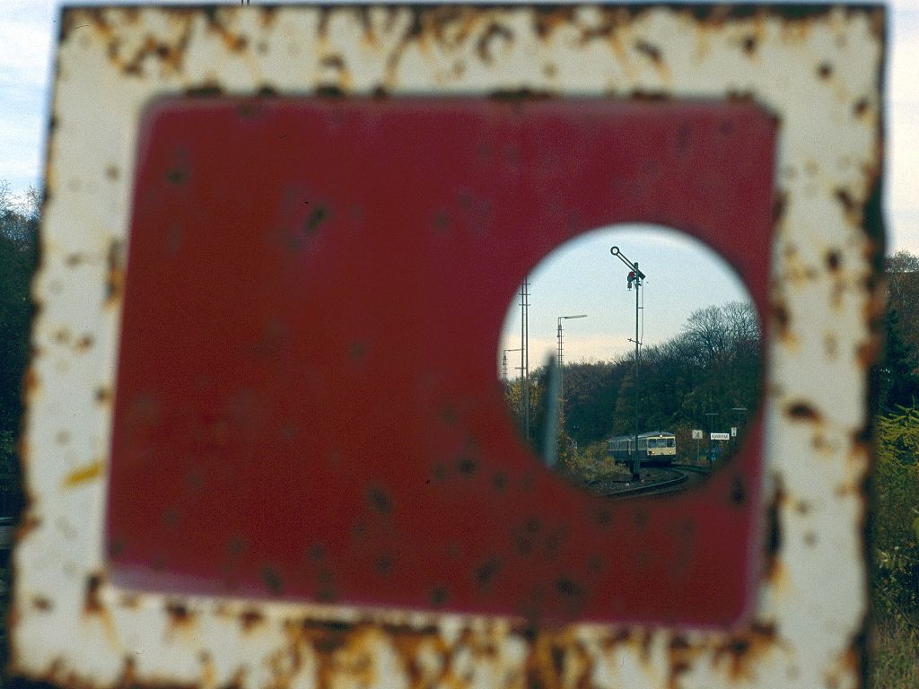 Durch die Sh2-Scheibe (Gleis 1 war wg. einer defekten Brücke gesperrt) ein Blick auf den Bf. Neanderthal im Oktober 1994.