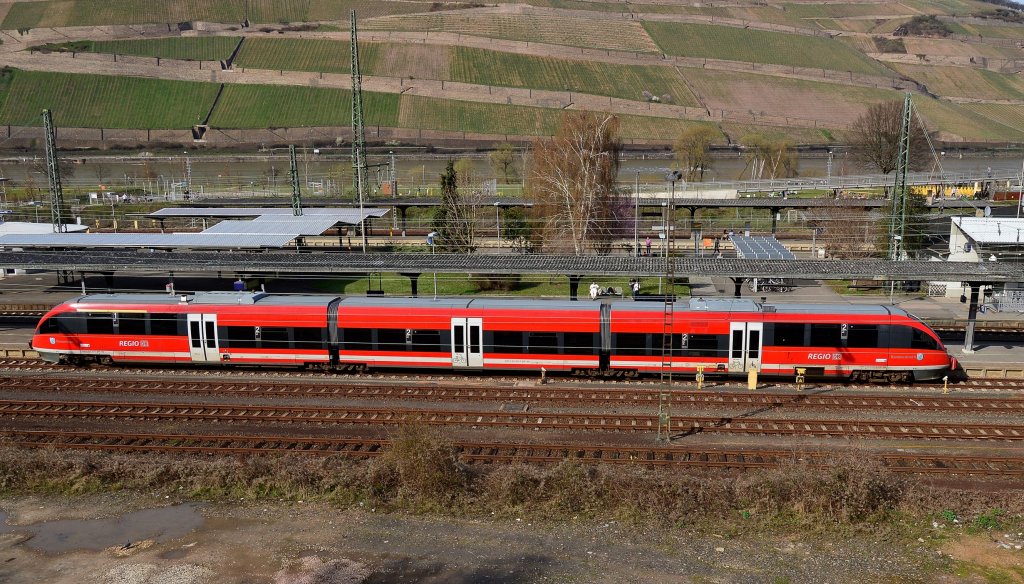 In Bingen am Bahnsteig steht der 643 021-8 Rammelsbach bereit zur Abfahrt in Richtung Kaiserlautern. 14.4.2013