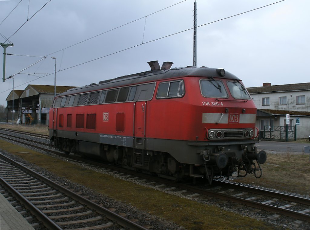 Obwohl es in Züssow drei Abstellgleise gibt,stand die Niebüller 218 380,am 13.April 2013,bis zur Rückleistung nach Heringsdorf,vier Stunden auf dem Kreuzungs-und Überholgleis.