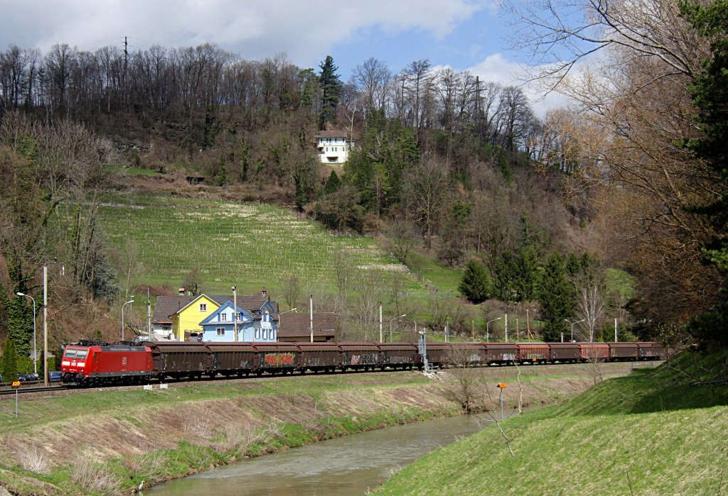 Zum Leidwesen des Fotografen keine Schweizer E-Lok. Am 13.04.2013 zieht eine 185er den aus Schiebewandwagen bestehenden Ganzzug bei Au SG in Richtung Buchs.
