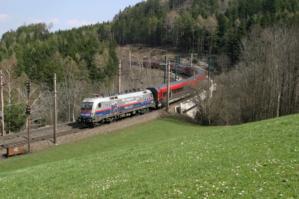 1116.200 in der Railjet-Versuchslakierung im Frühling bei Eichberg am 18.4.13