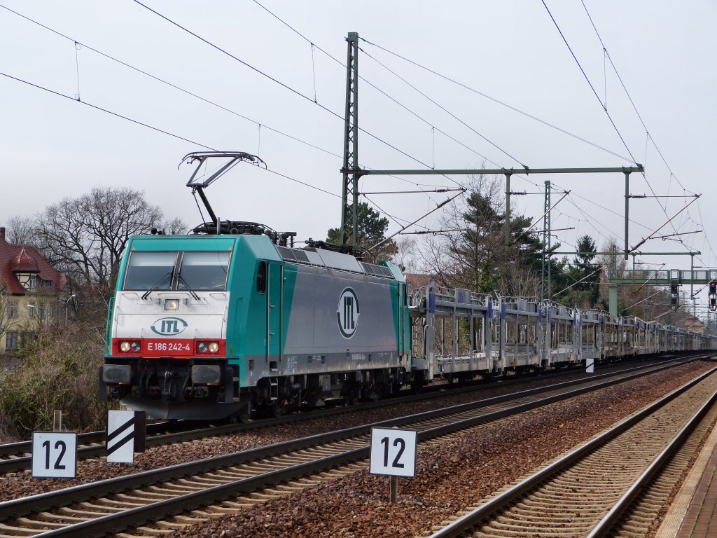 186 242 der ITL bringt ihre leeren Autotransportwagen zurück in Richtung Pirna.