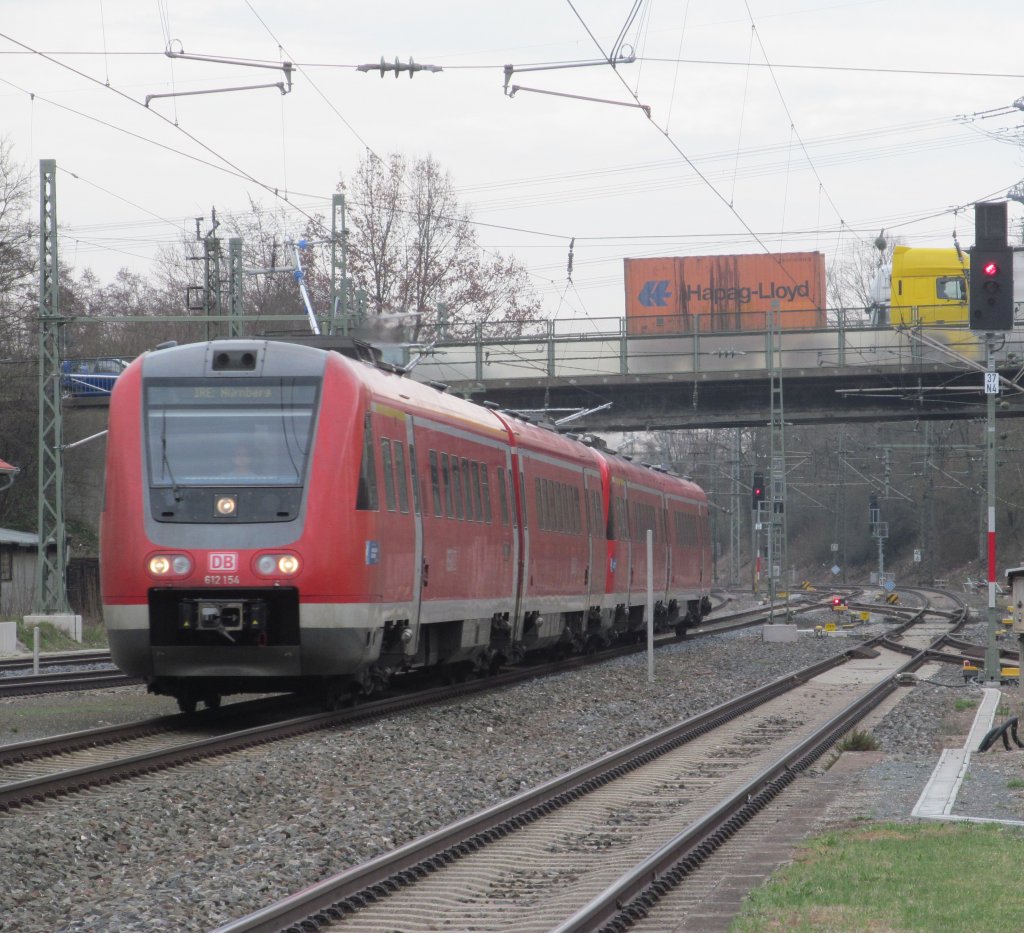 612 154 und ein weiterer 612er durchfahren am 16. April 2013 als IRE nach Nürnberg Hbf den Bahnhof Hochstadt-Marktzeuln.