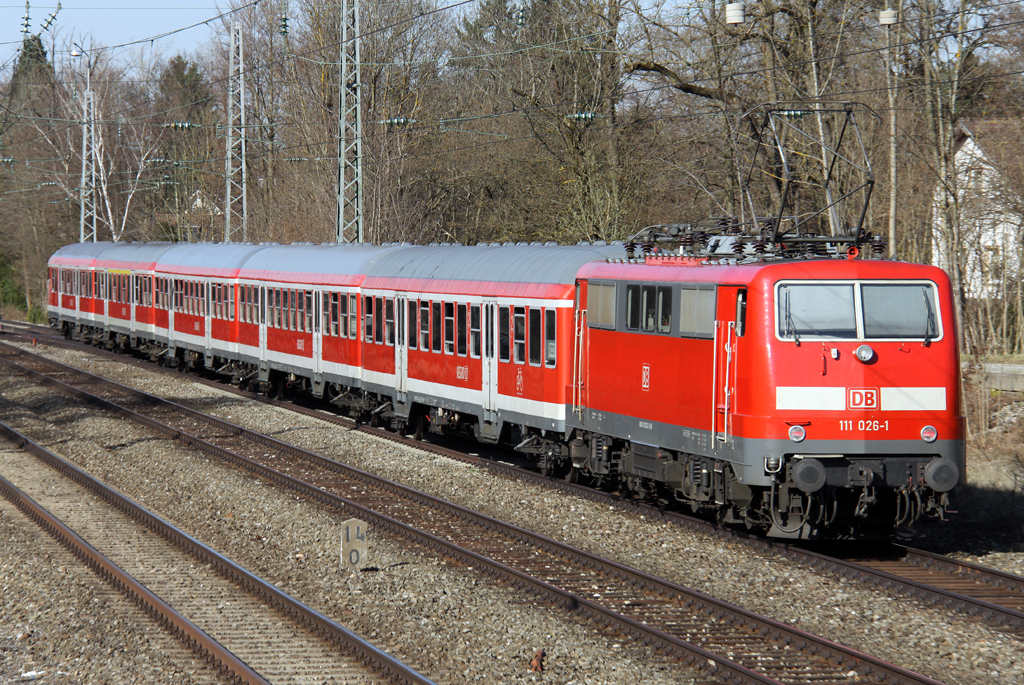 Die 111 026-1 mit der RB von München nach Garmisch Partenkirchen durch Gauting am 15.04.2013