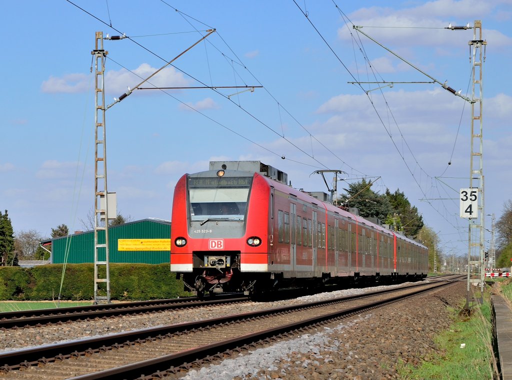 Ein RE8 Zug nach Mönchengladbach, der vom 425 523-8 geführt wird, ist hier bei Gubberath abgelichtet zu sehen. 18.4.2013