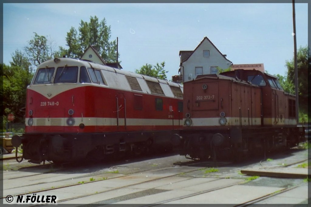 Mit 228 748 und 202 373 warten zwei typische DR Lokomotiven im Bw Sonneberg auf neue Aufgaben im September 1996
