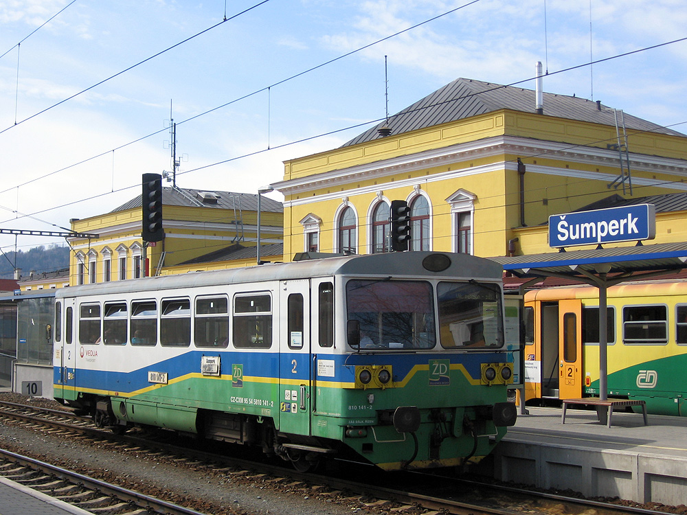 ¦umperk. 810.141 der tschechische privatische Regionalbahn - ´eleznice Desná in ¦umperk. Die Bahn geht aus ¦umperk über Petrov nad Desnou nach Kouty nad Desnou. Aus Petrov geht kurze Bahnstrecke nach Sobotín.