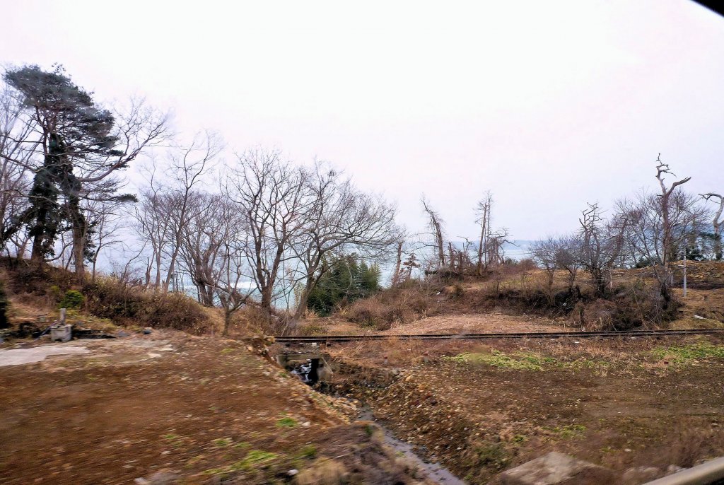 Kesennuma-Linie: Wie schön hoben sich hier in Ôya Kaigan die grün-weissen Züge vor dem Hintergrund des blauens Meers ab! Die Geleise sind jetzt abgebaut. Aufnahme aus dem Schienenersatz-Bus. 15.Februar 2013.