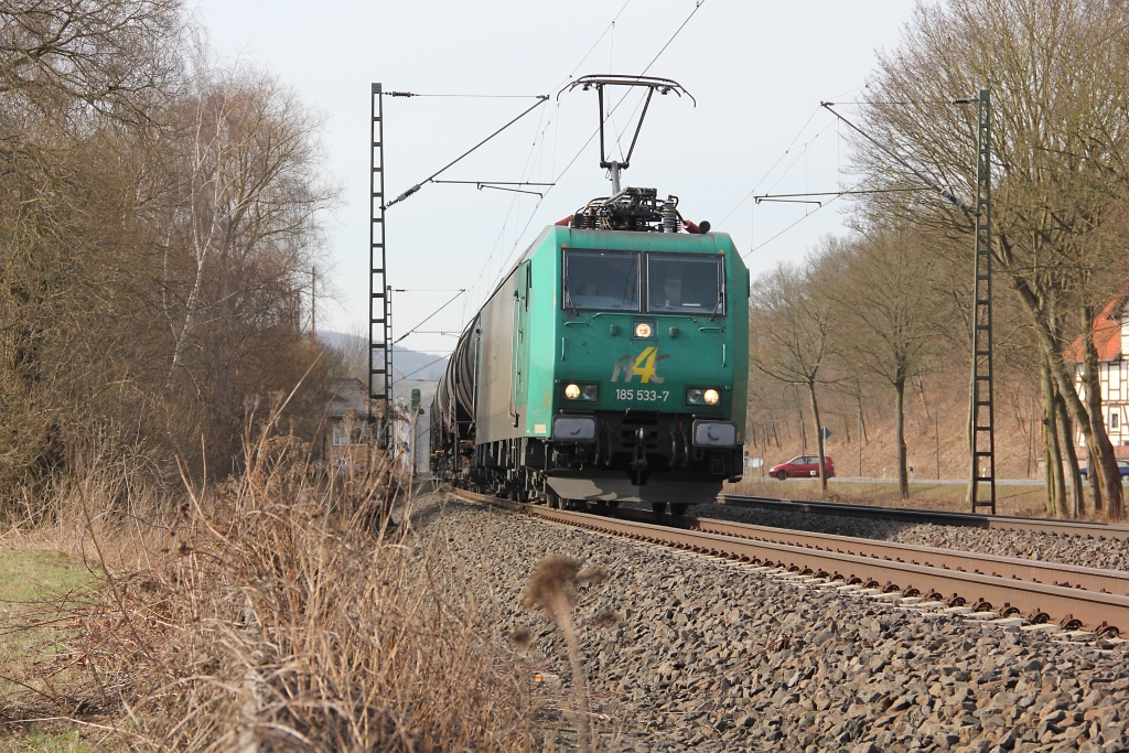 185 533-7 mit Kesselwagenzug in Fahrtrichtung Norden. Aufgenommen am 27.03.2013 in Wehretal-Reichensachsen.
