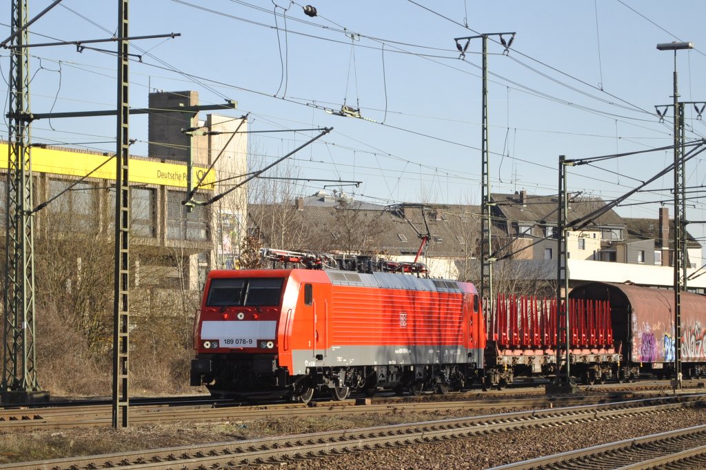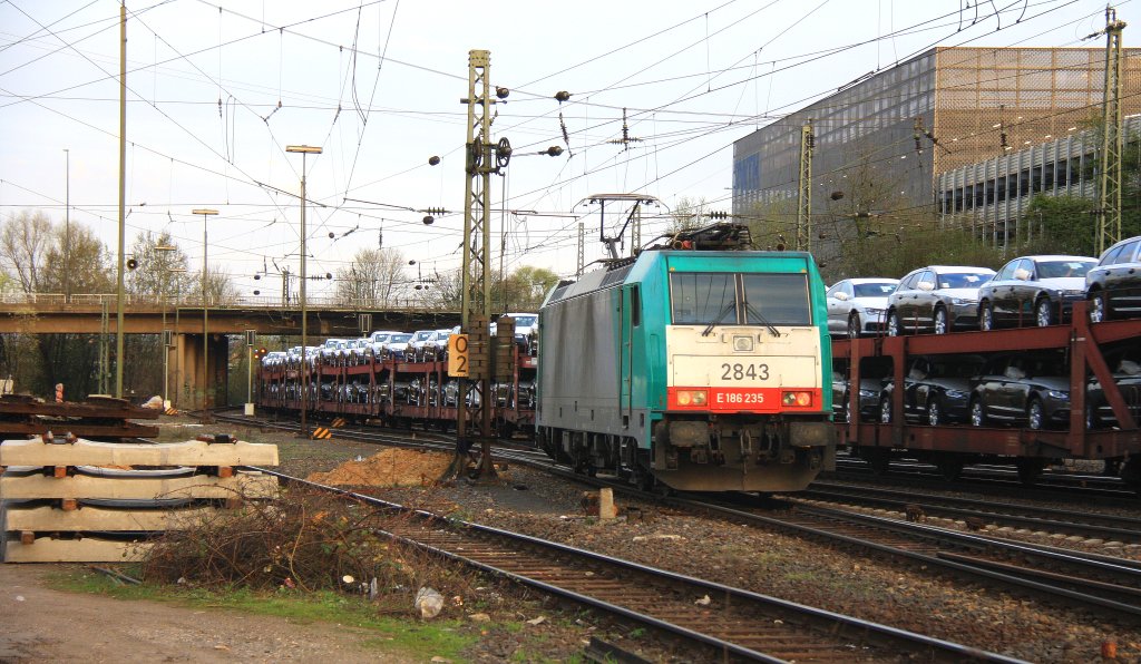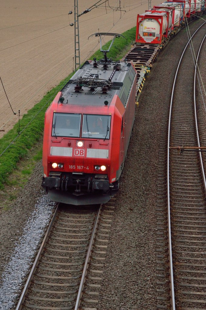 Die Steigung bei Noithausen erklimmend kommt die 185 167-4 mit einem KLV gen Mönchengladbach gefahren, ich habe den Zug von der L116 herunter fotografiert. 21.4.2013