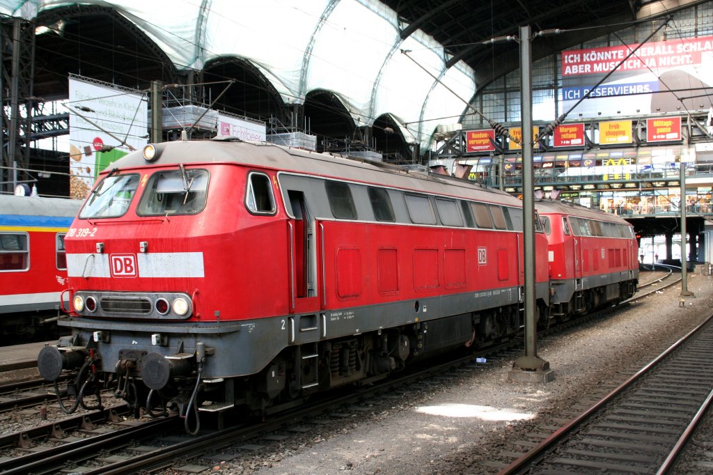 212 083-0 und 212 324-8 begegnen sich im Sommer 1978 im Bahnhof Solingen-Ohligs (heute Solingen Hbf.). Mit der Eröffnung der S 7 im Jahr 1980 entfielen die meisten durchgehenden Verbindungen nach Düsseldorf und die weiter in Richtung Solingen Stadtmitte bzw. Remscheid reisenden Fahrgäste müssen hier umsteigen. Am Kilometerstein ist erkennbar, dass die Kilometrierung in Ohligs neu beginnt.