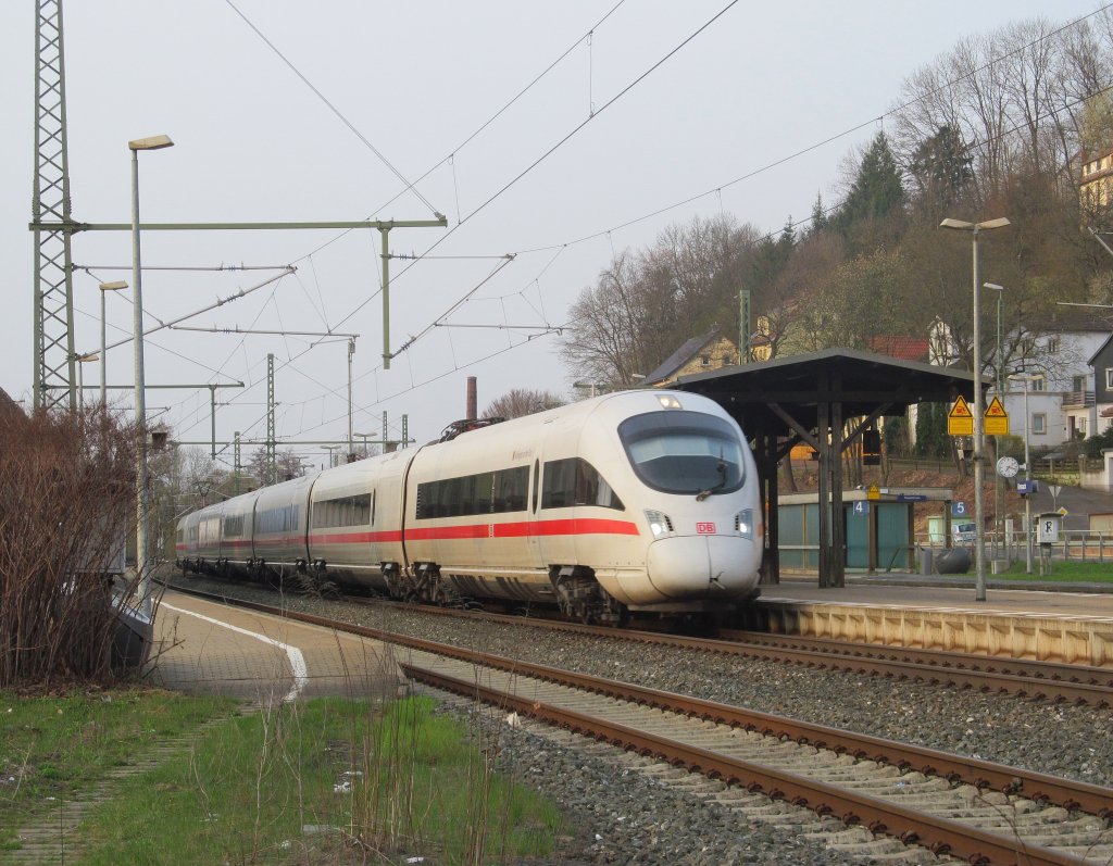 411 062 "Vaihingen an der Enz" durchfährt am 21. April 2013 als LPFT 78874 nach Leipzig Hbf den Bahnhof Kronach.