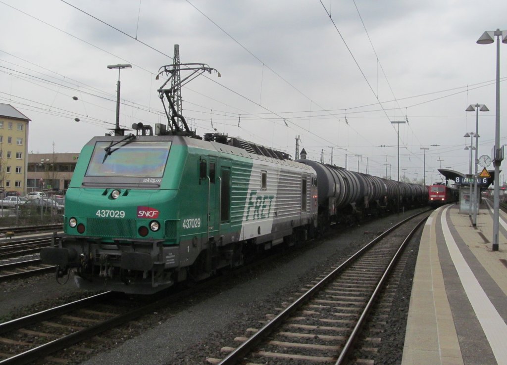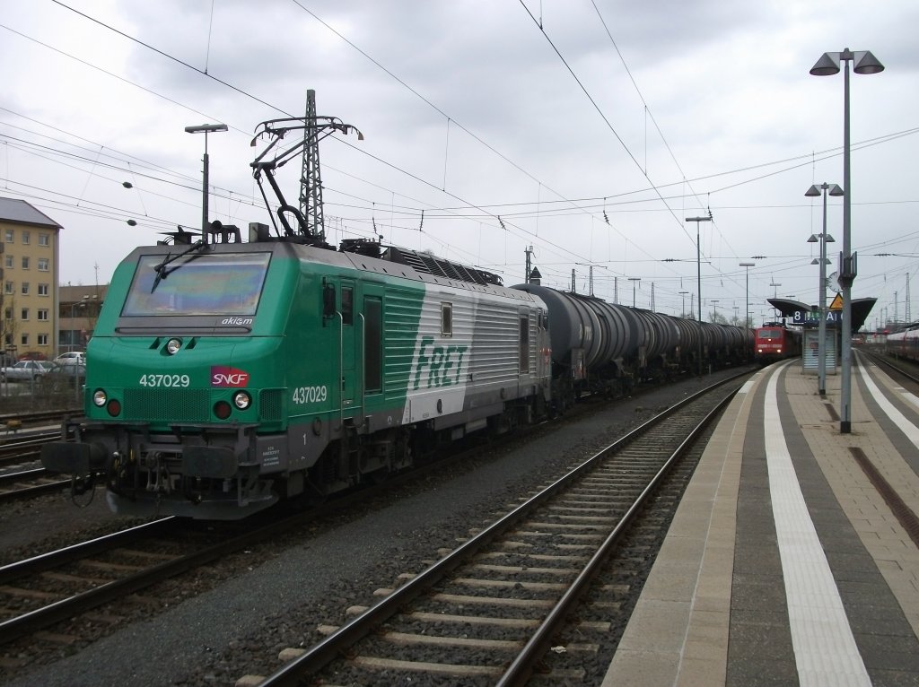 437 029 von Akiem  FRET  steht am 19. April 2013 mit einem Kesselzug im Bahnhof Bamberg.
