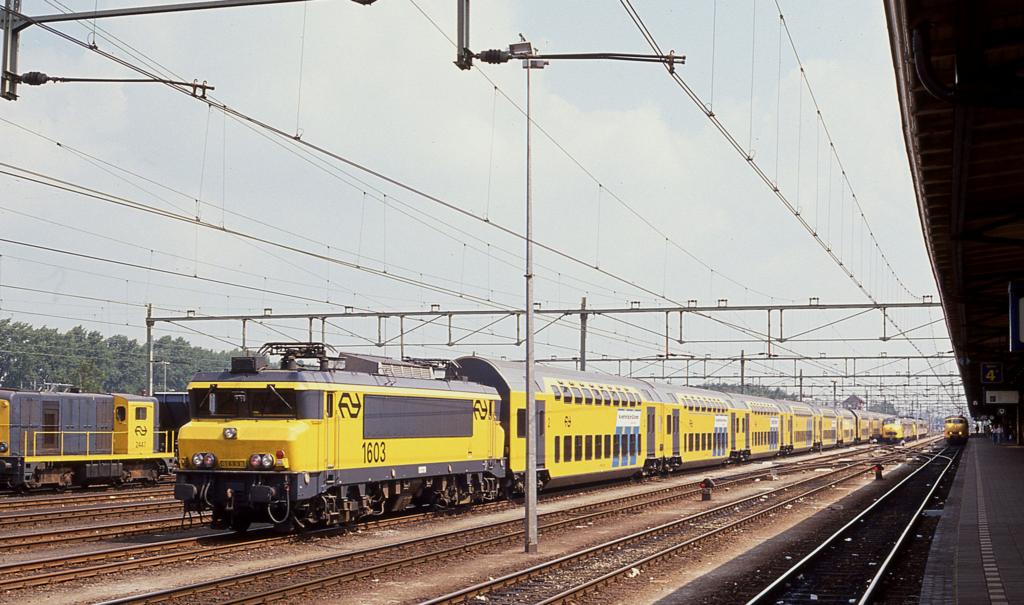 Am 15.7.89 steht die NS Elektrolok 1603 im Bahnhof Rosendaal vor einem langen Doppelstockzug.