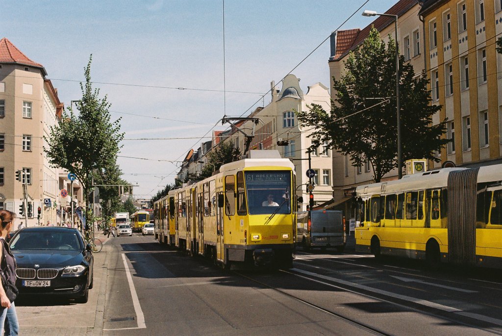 Viel los ist hier an der Straßenbahnhaltestelle am Holländischen Platz in Kassel, sodass sich eine Tram hier hinter zwei Bussen anstellen muss. Aufgenommen am 4.4.13