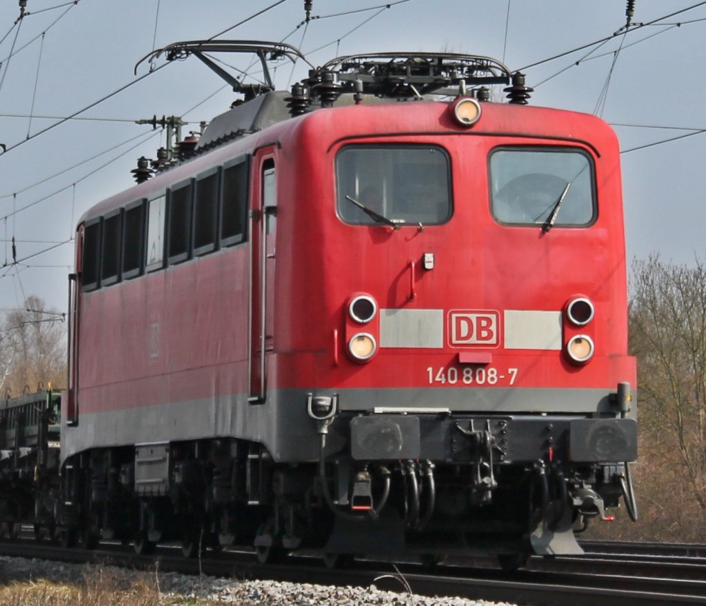 Lokportrait von 140 808-7 am 04.04.2013 mit einem KLV, auf dem Kiesbehältern transportiert wurden, in Orschweier.