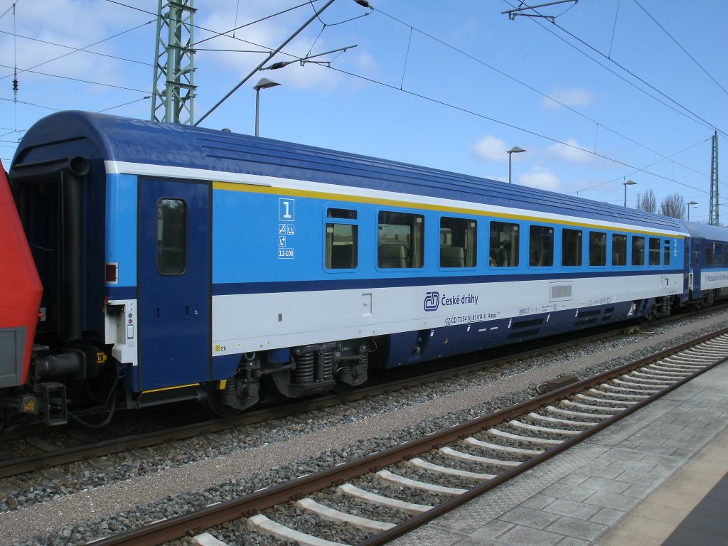 Tschechischer Großraumwagen Ampz 73 54 10-91 014-6 eingereiht im EC 379 Binz-Brno am 20.April 2013.Aufgenommen in Bergen/Rügen.