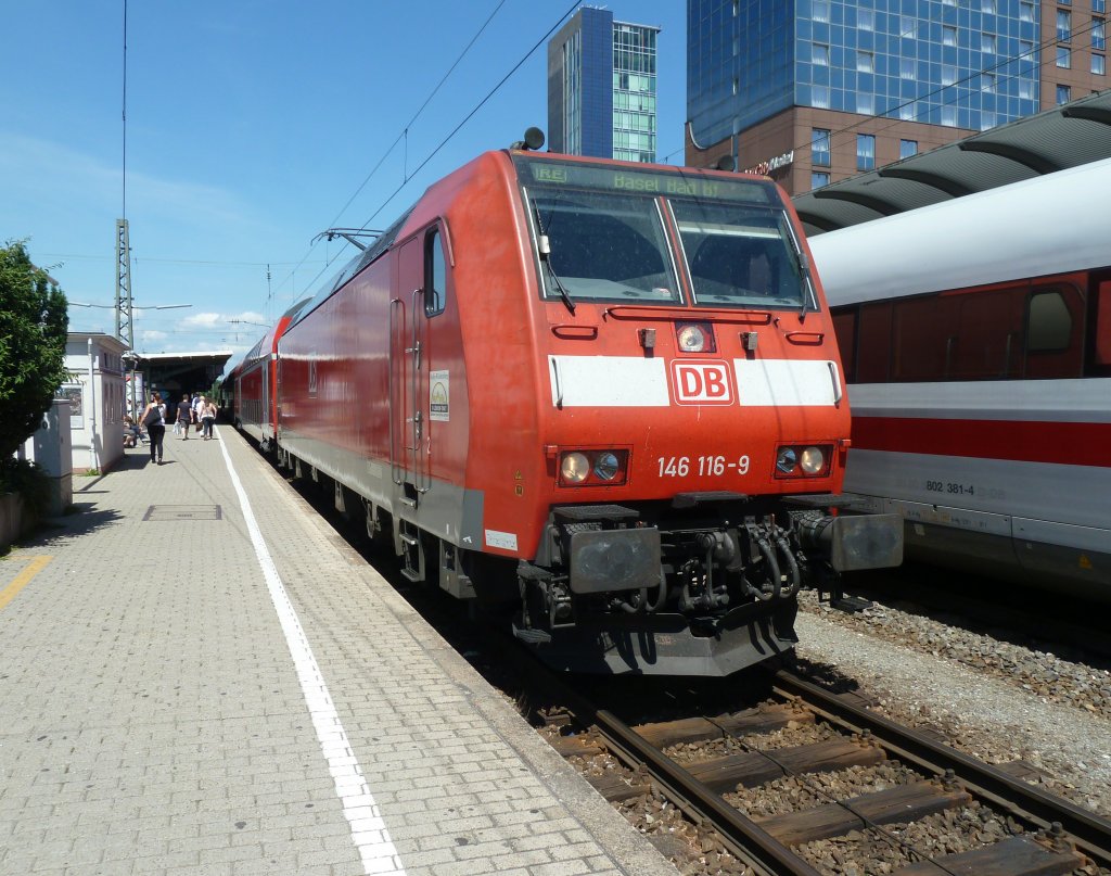 146 116-9 mit einem RE nach Basel Bad. Bf am 23.06.12 beim Halt in Freiburg (Breisgau) Hbf.