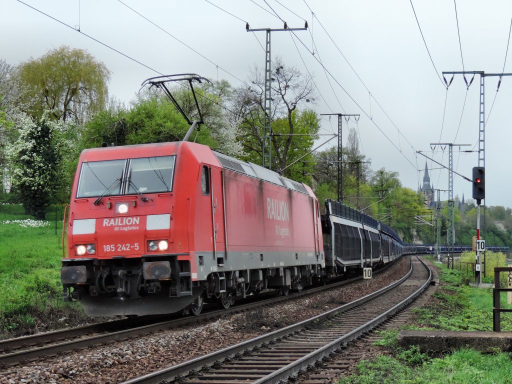 185 242 durchfährt mit ihrem leeren Autotransport das Frühlingshafte Dresden Cotta.