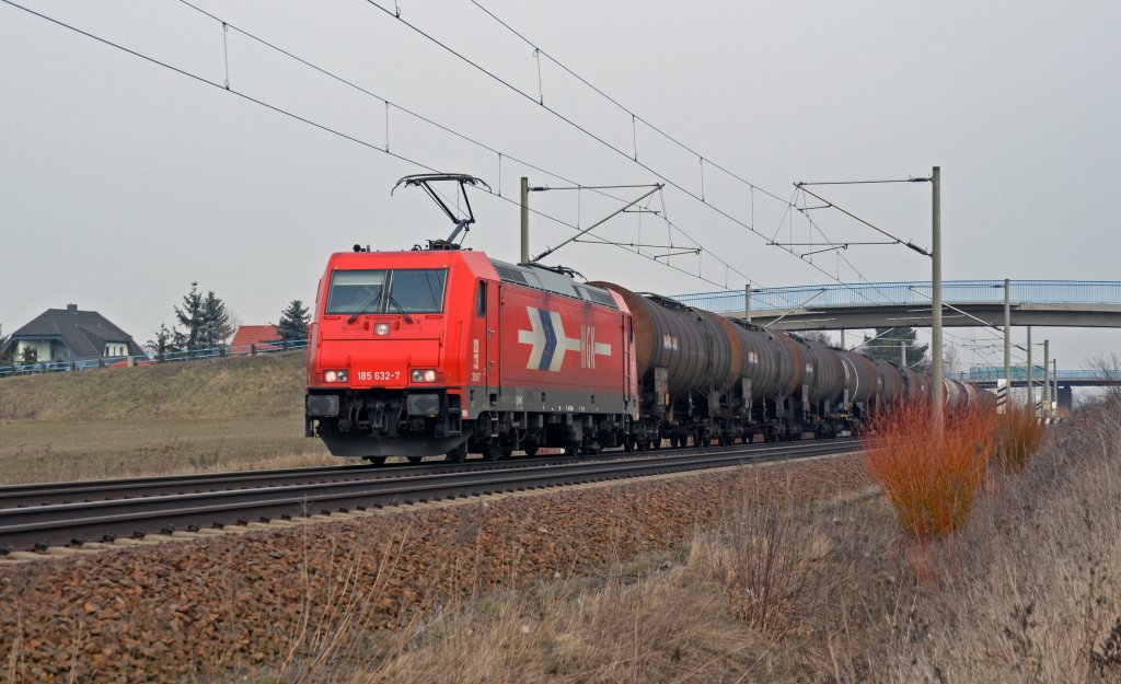 185 632 zog am 09.04.13 einen Kesselwagenzug durch Zschortau Richtung Leipzig.
