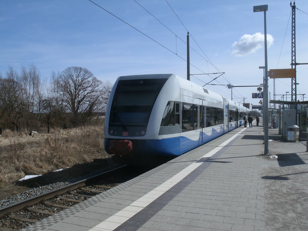 Auf Anschlußreisende in Richtung Usedom wartete,am 06.April 2013,in Züssow die UBB:646 110 und 646 123.