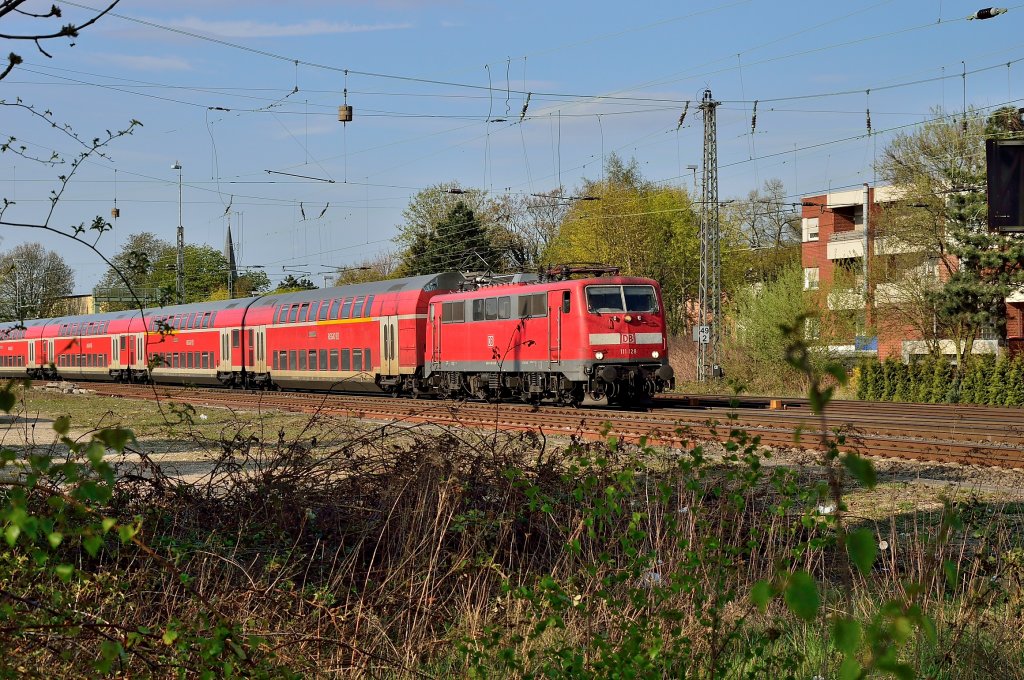 Ausfahrt eines von 111 128 gezogenen RE4 Zuges nach Aachen aus dem Rheydter Hbf. 24.4.2013