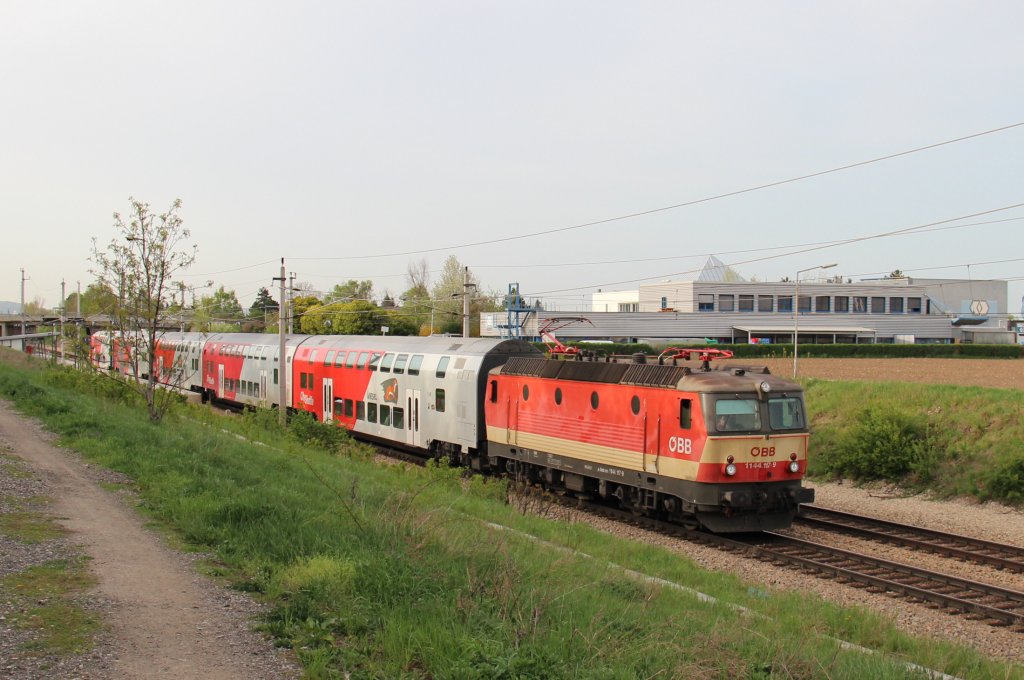 Mit dem 2341-Zug befasste sich 1144 092 auf der Fahrt von Bernhardsthal (Beh) nach Wiener Neustadt Hauptbahnhof (Nb) beim Übersetzen des Entlastungsgewässer Neue Donau; am 26.04.2013