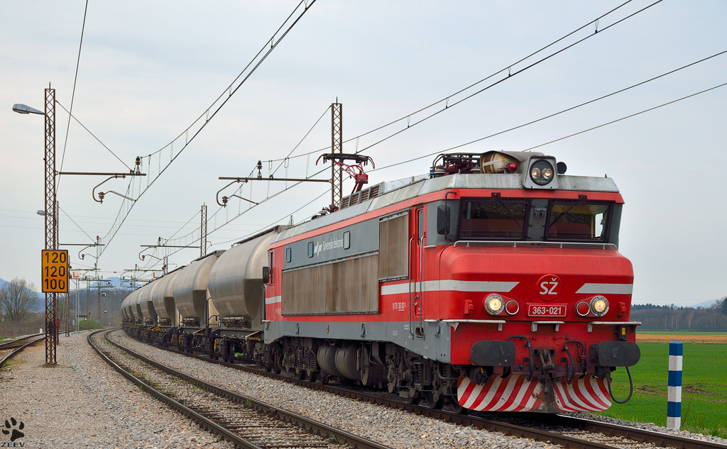 S´ 363-021 zieht Kesselzug durch Pragersko Richtung Norden. /17.4.2013