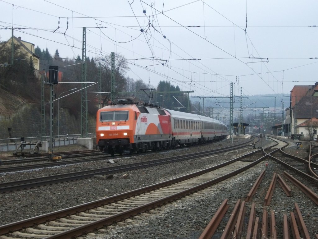 120 112 "Märklin" durchfährt am 05. April 2013 mit IC 2909 nach München den Bahnhof Kronach Richtung Lichtenfels.