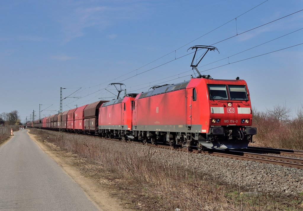 Das doppelte Lottchen kommt hier mal zwischen Osterath und Neuss herangefahren, die 185 174-0 und die 185 186-4 beiden haben mal wieder einen Selbstentladerwagenzug. 7.4.2013