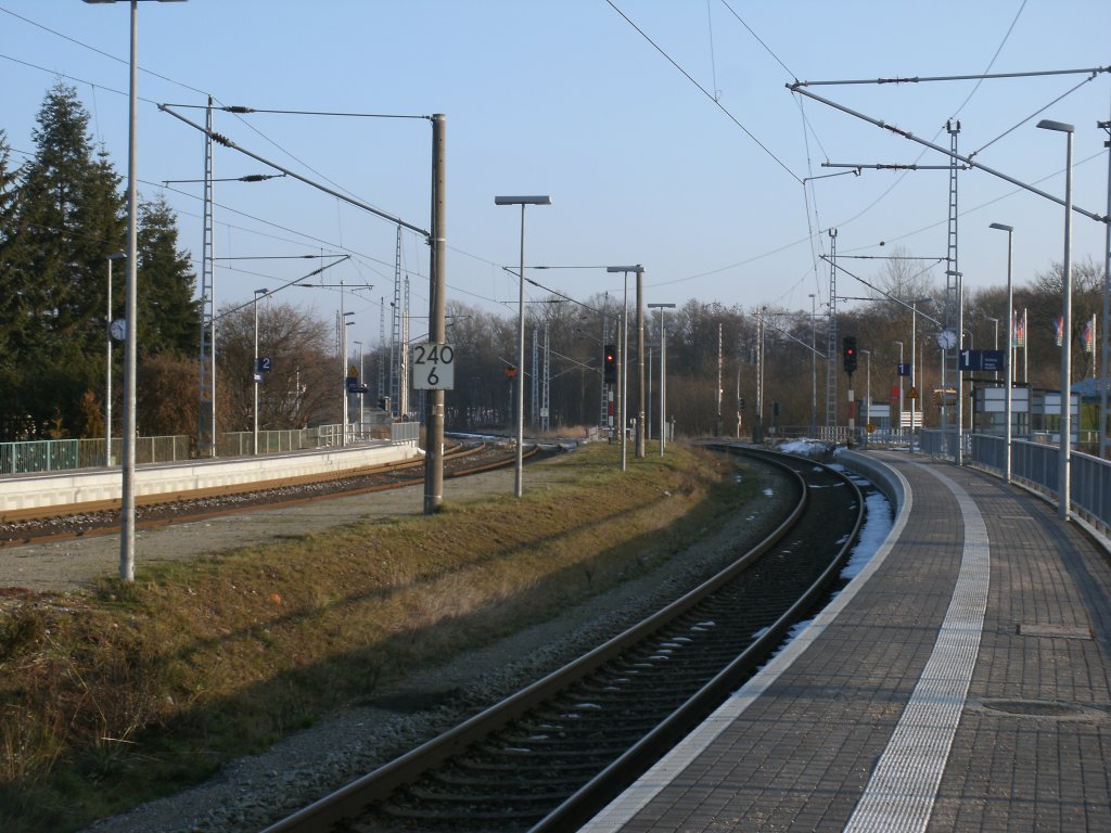 Der in einem Bogen liegende Bahnhof Samtens in Richtung Bergen/Rügen am 21.Dezember 2012.
