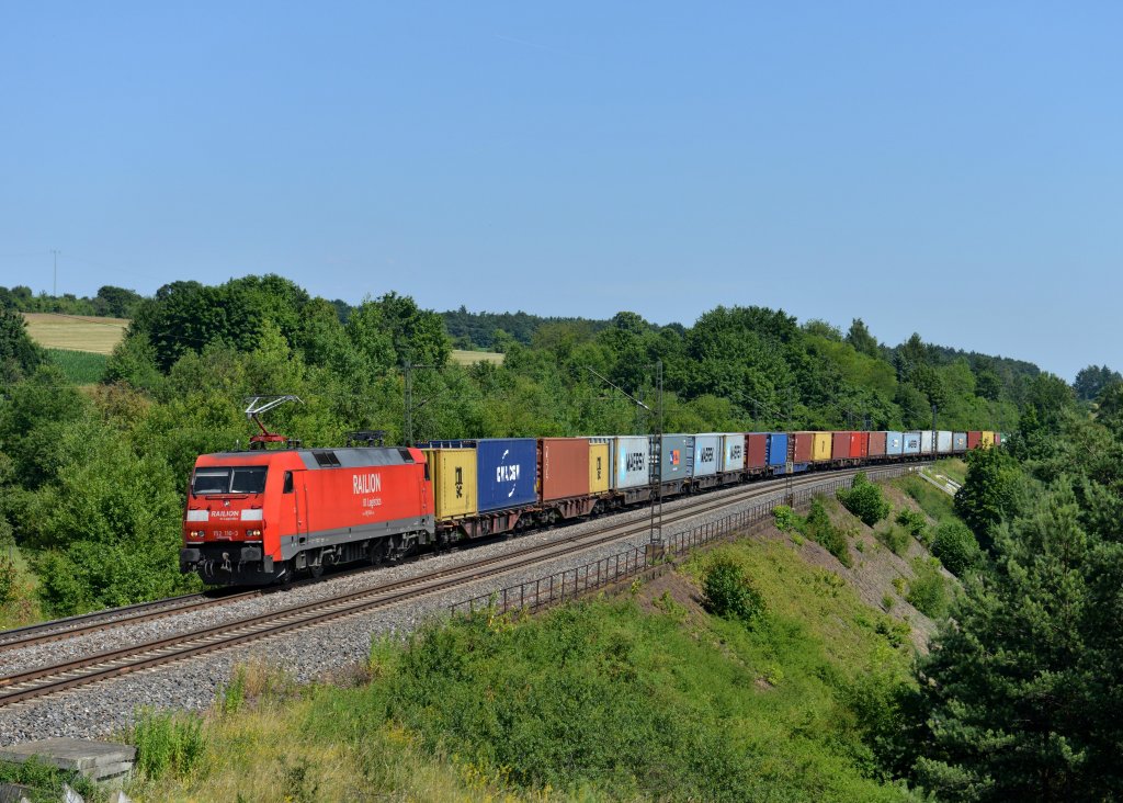 152 110 mit einem Containerzug am 16.07.2013 bei Laaber.