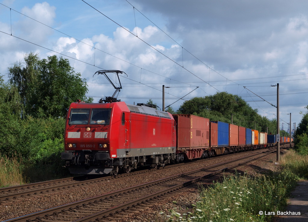 185 050-2 hat soeben Ausfahrt aus dem Rbf Alte-Süderelbe erhalten und passiert nun Hamburg-Moorburg. 09.08.13.