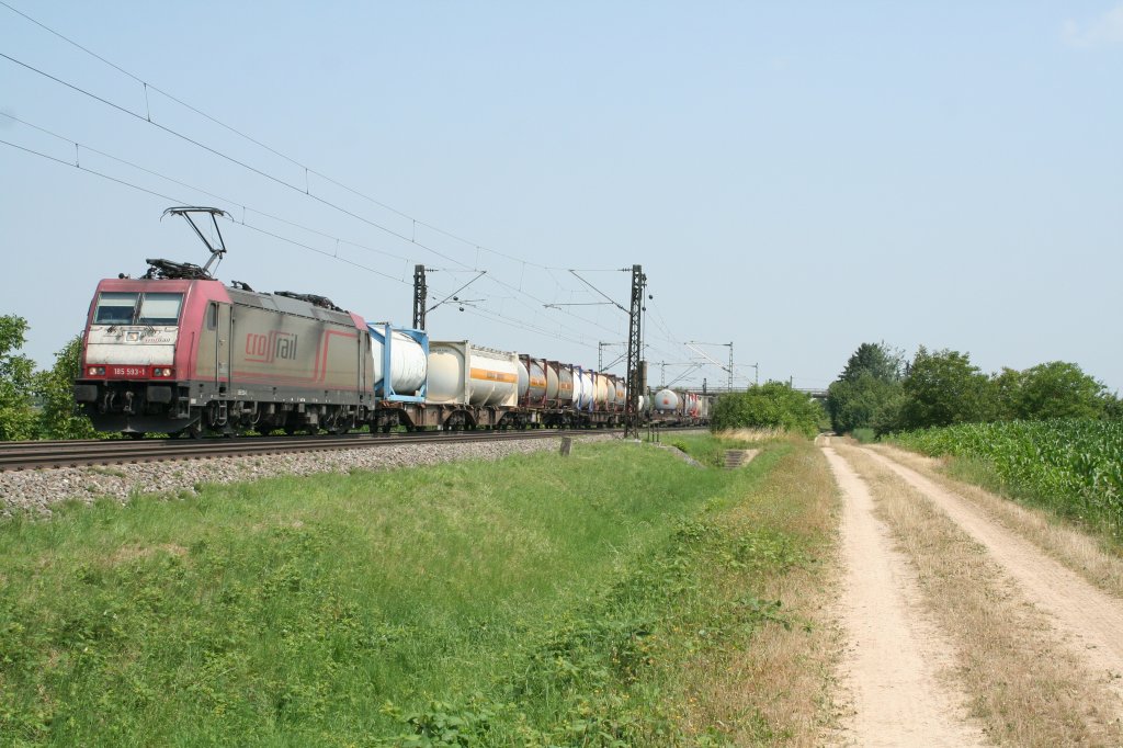 185 593-1 mit einem KLV-Zug gen Süden am Mittag des 19.07.13 kurz vor Müllheim (Baden).
