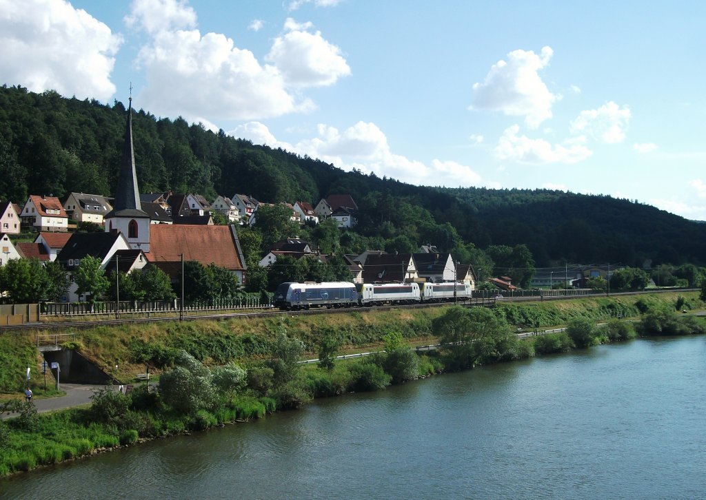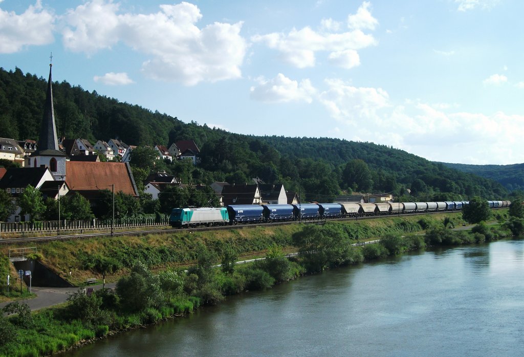 185 609 zieht am 10.August 2013 einen Getreidezug durch Wernfeld Richtung Gemünden am Main.