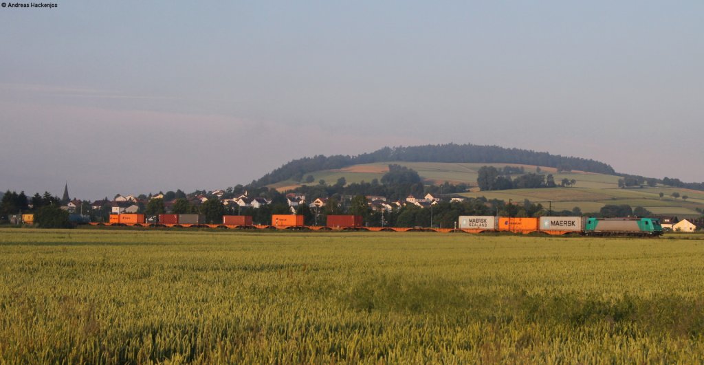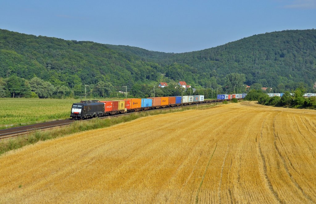 185 518 mit einem Containerzug nach Hamburg am 06.07.2013 bei Himmelstadt.