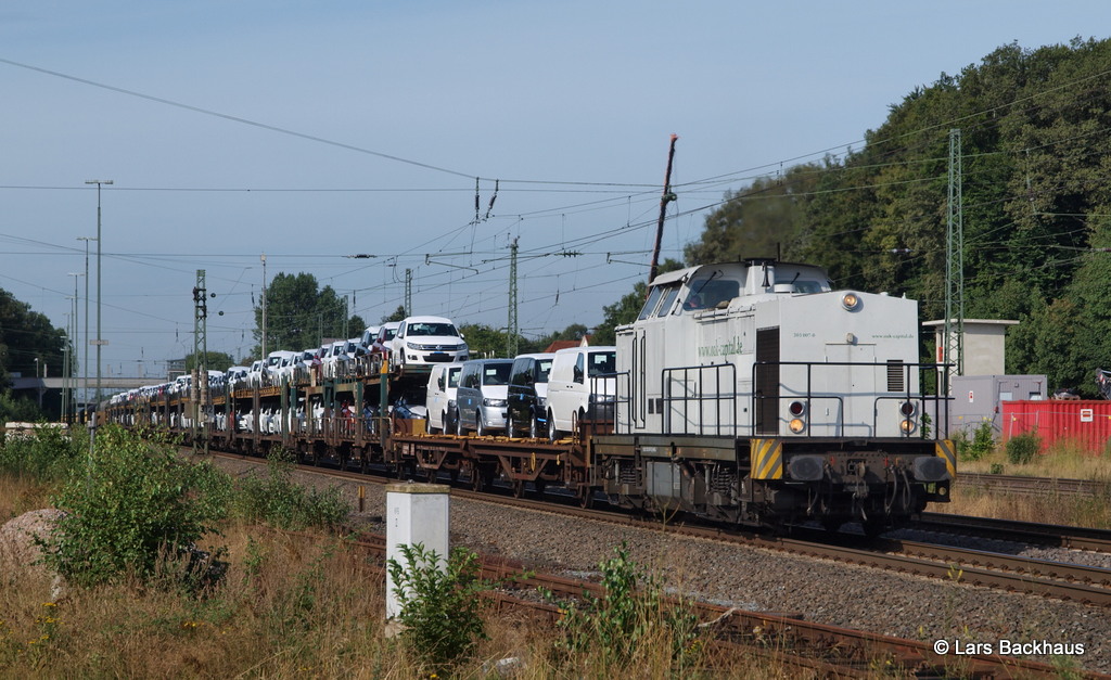 203 007-0 oak-Capital hat am 09.08.13 einen langen ARS Autologistiker nach Cuxhaven am Haken und passiert Tostedt.