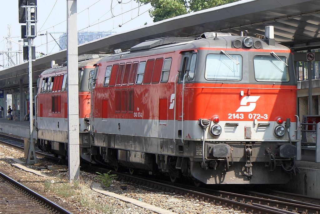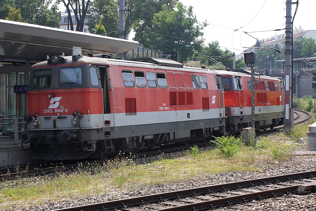 2143 072-3 und 2143 044-2 fahren am 09.August 2013 als LZ 18088 von Klein Schwechat nach Matzleinsdorf durch den Bf. Wien Meidling.