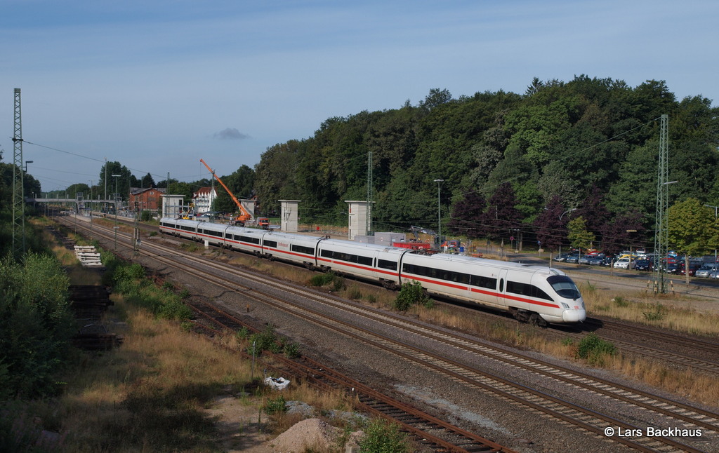 411 007 "Erfurt" passiert am 09.08.13, vermutlich als ICE-Umleiter von der Hannoverschen Schiene, Tostedt Richtung Hamburg.