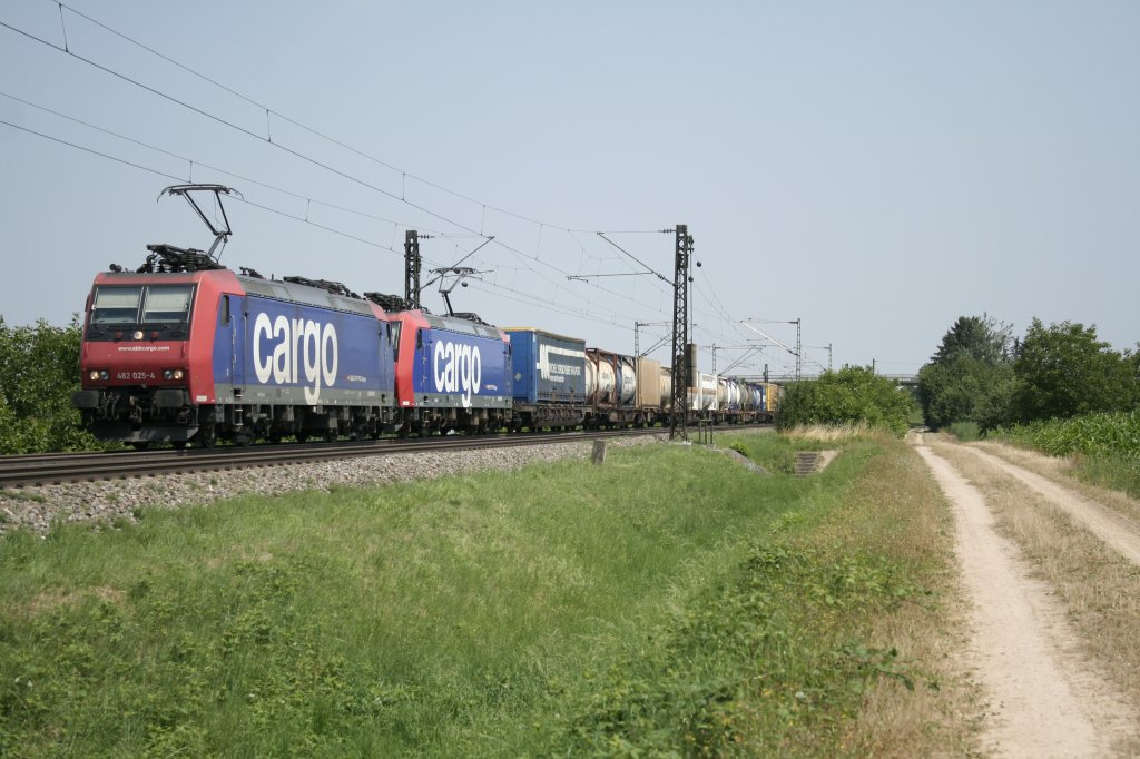 482 025-4 und 482 022-1 mit einem KLV-Zug am Mittag des 19.07.13 bei Müllheim-Hügelheim.