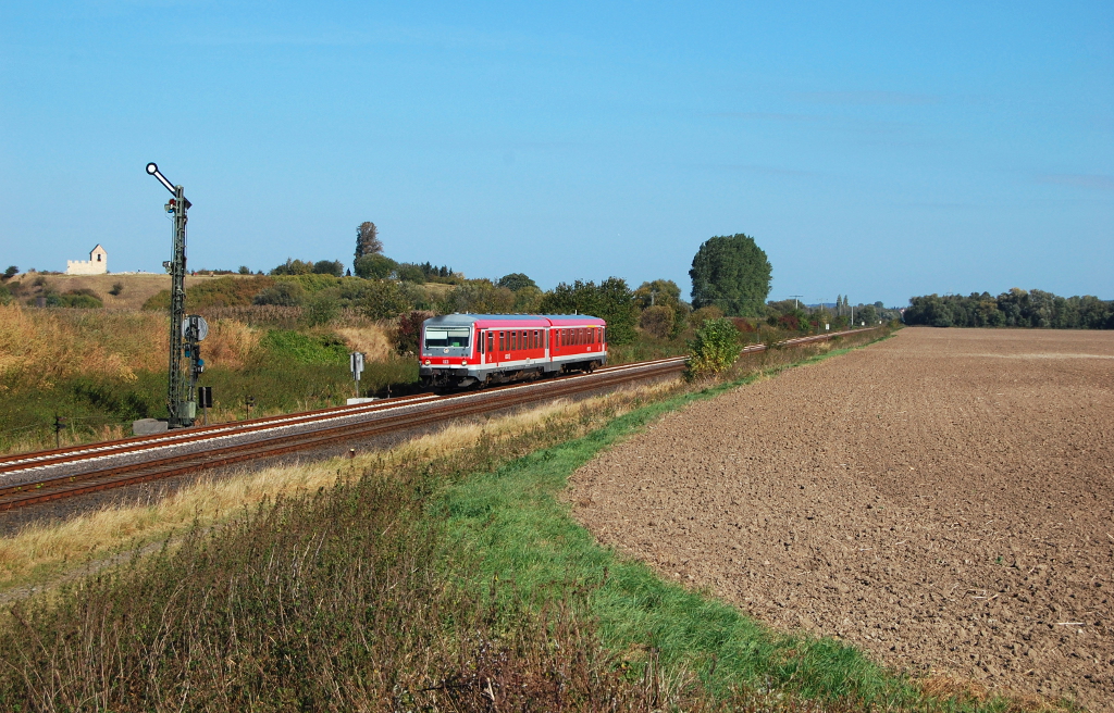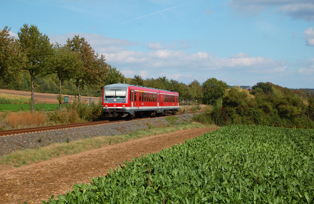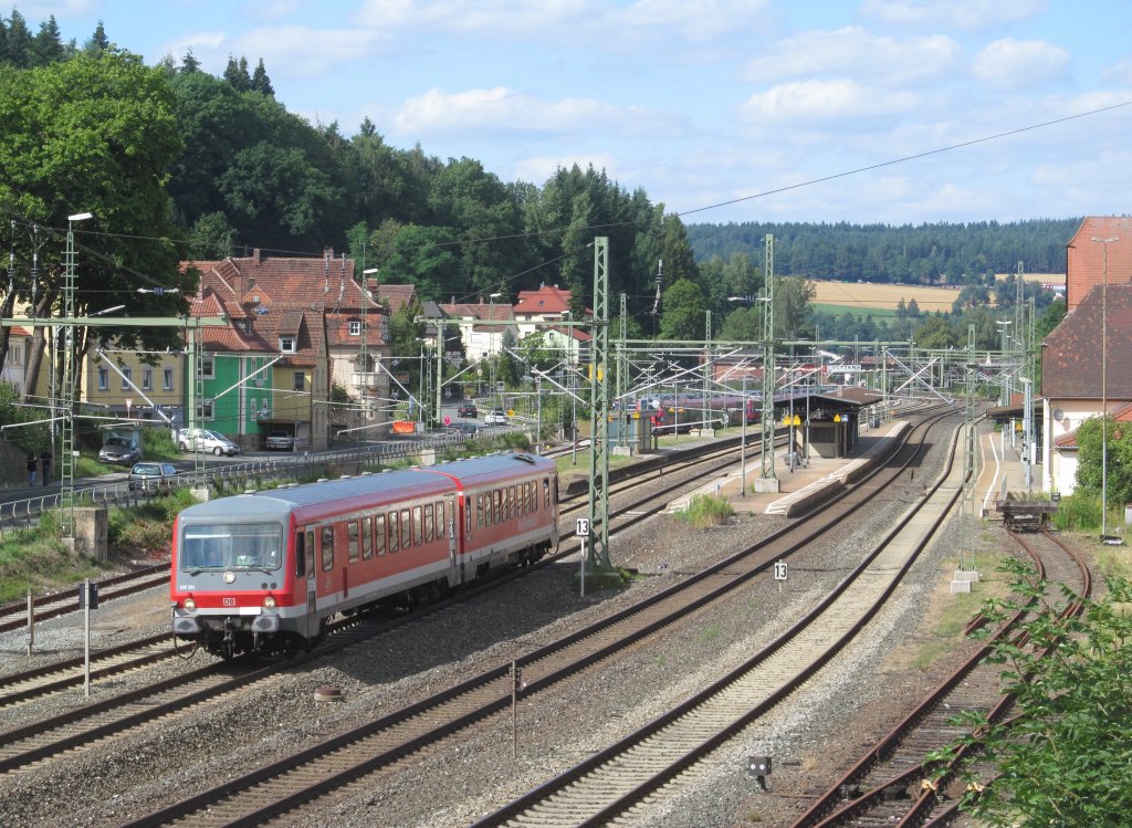 628 264 der Westfrankenbahn verlässt am 11. August 2013 als Sonderzug nach Öhringen den Bahnhof Kronach.