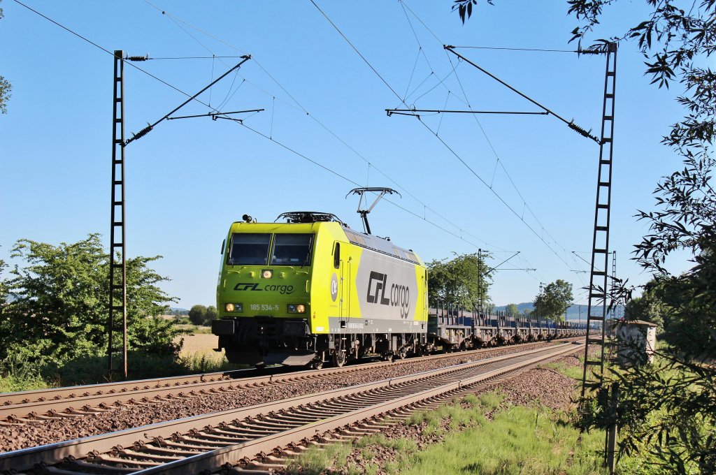 Am 1.8.2013 war CFLCA 185 534 mit Brammen auf Flachwagen bei Elze(Han) auf dem Weg Richtung Norden.