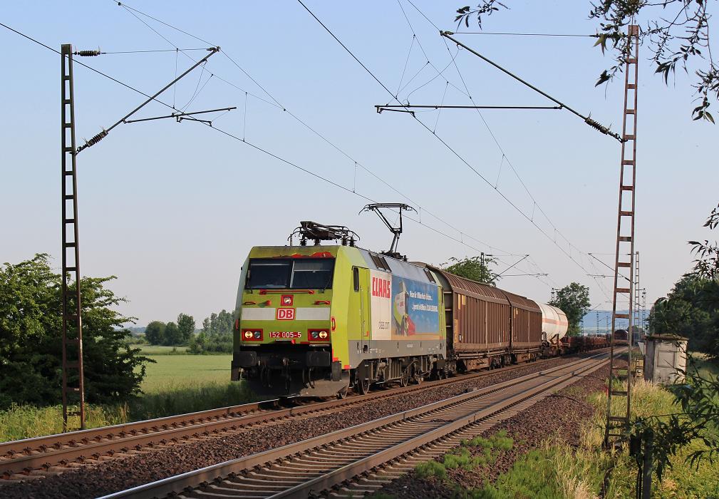 Am 18.Juni 2013 war DBSR/CLAAS 152 005 mit einem gemischten Güterzug bei Elze/Han auf dem Weg Richtung Seelze.