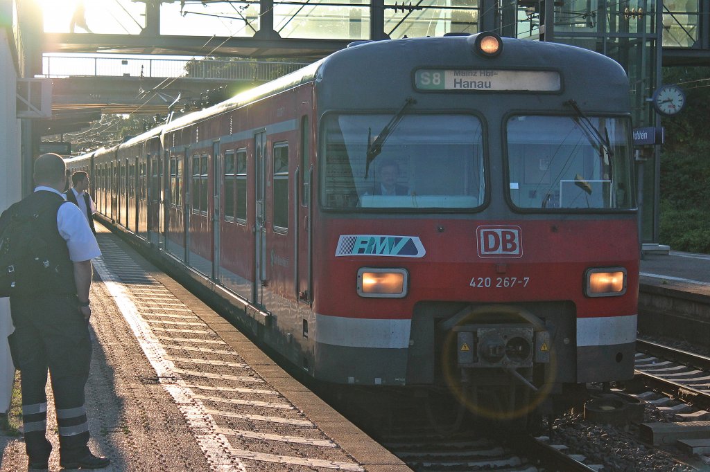 Am 21.06.2013 bestandt die S8 von Mainz nach Hanau aus der Einheit ET420 267-7 und einer weiteren Einheit. Hier ist die S-Bahn gerade bei der Einfahrt in den Bahnhof von Mainz-Bischofsheim.